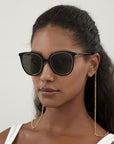 Il primo (solitamente tra 48 e 58) è la larghezza della lente in millimetri. Più alto è il numero, più larga è la lente. Il secondo (tra 15 e 25) rappresenta la distanza tra le due lenti. L'ultimo (tra 135 e 150) indica la lunghezza delle astine. Se ti è capitato di indossare occhiali che non poggiano bene sulle orecchie, dovresti orientarti su una misura dell'asta di almeno 145 mm.